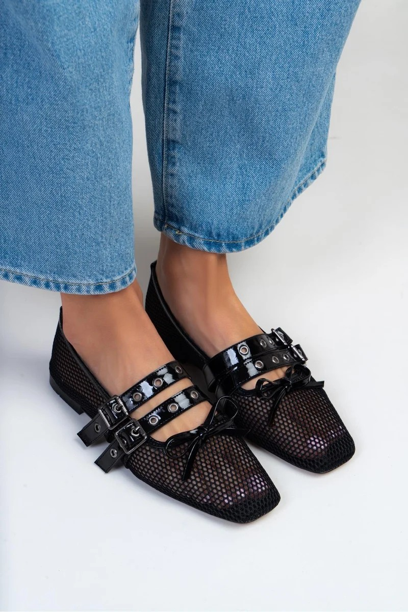 Chic mesh flats featuring double buckle straps, glossy patent accents, and delicate front bows. Stylish, breathable, and perfect for both casual and edgy looks.