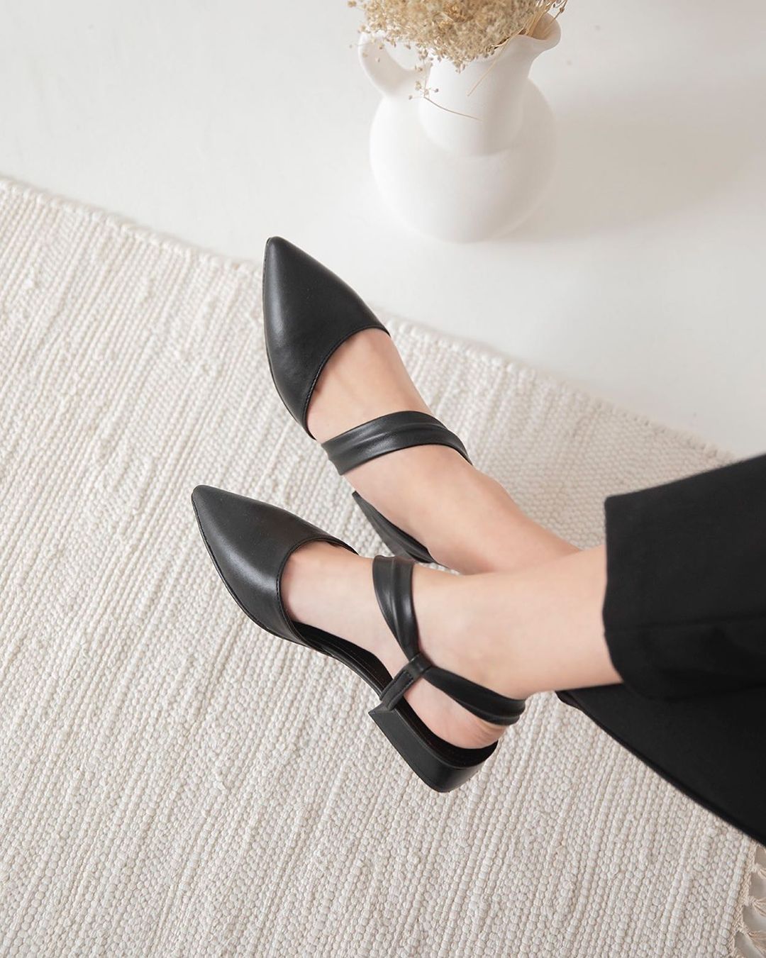 Elegant white pointed-toe flats featuring a soft, wide ankle strap for a secure and chic fit. Perfect for all-day wear, combining comfort with minimalist sophistication — ideal for both casual and polished looks.