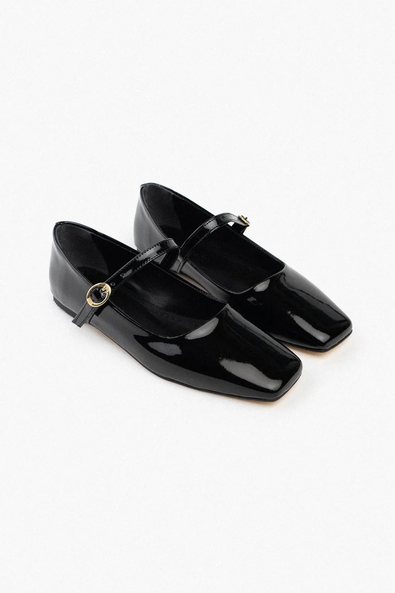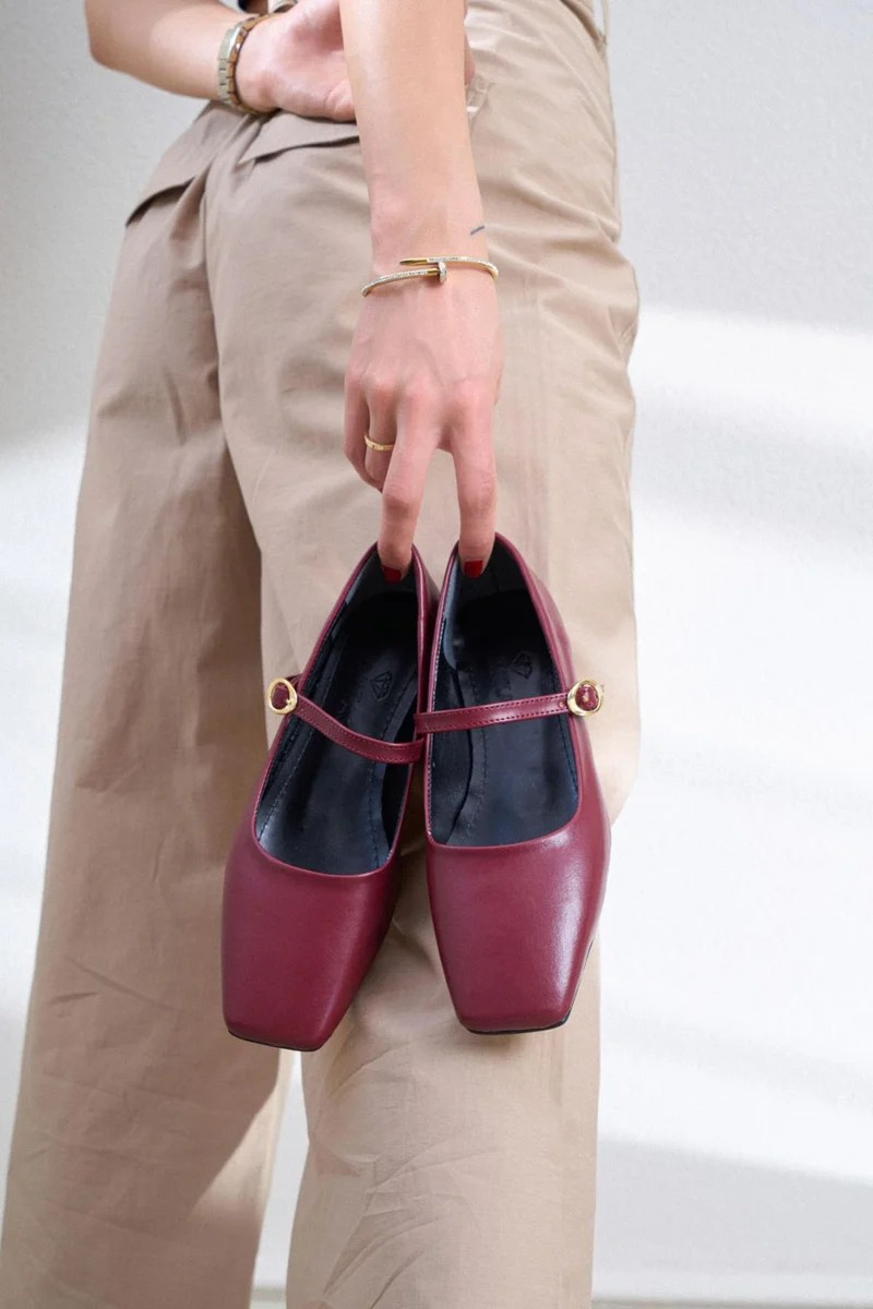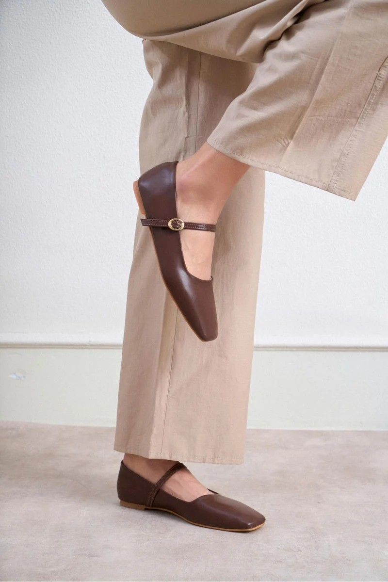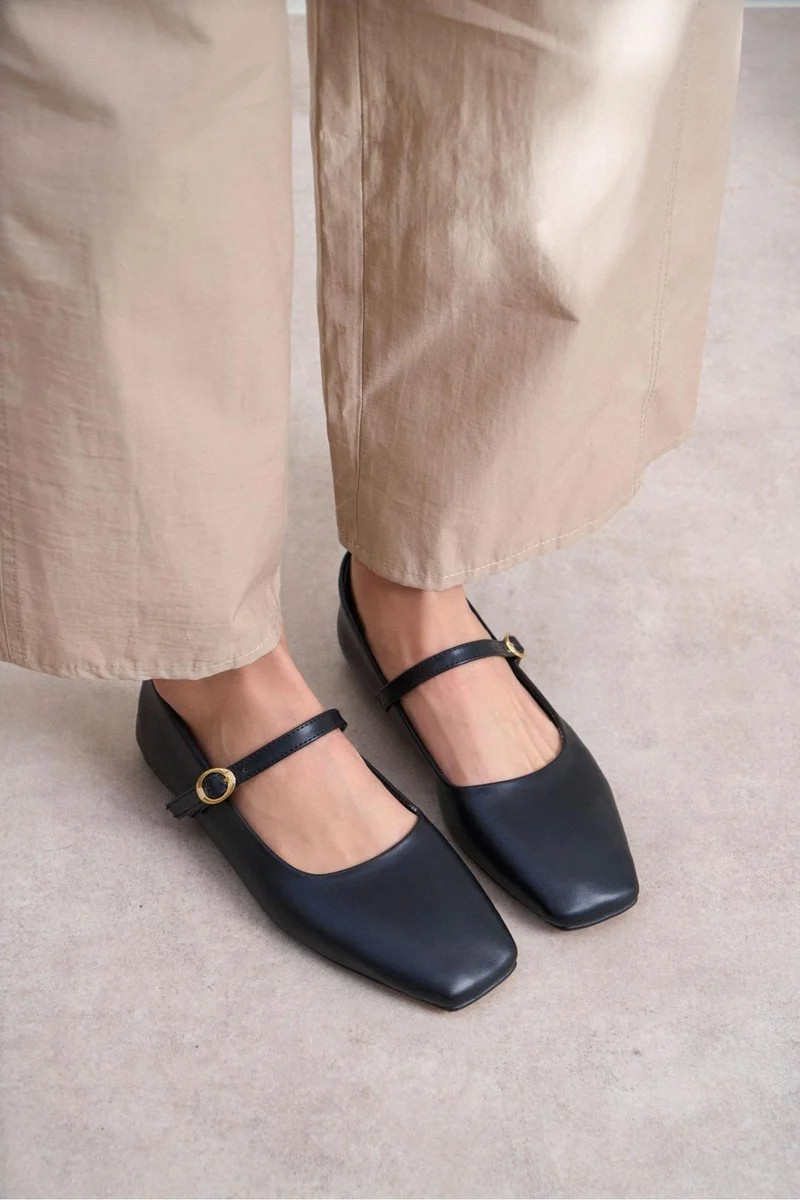Minimalist ballet flats with a soft matte finish, featuring a single slender strap with a gold buckle and a structured square toe for a modern, refined look.