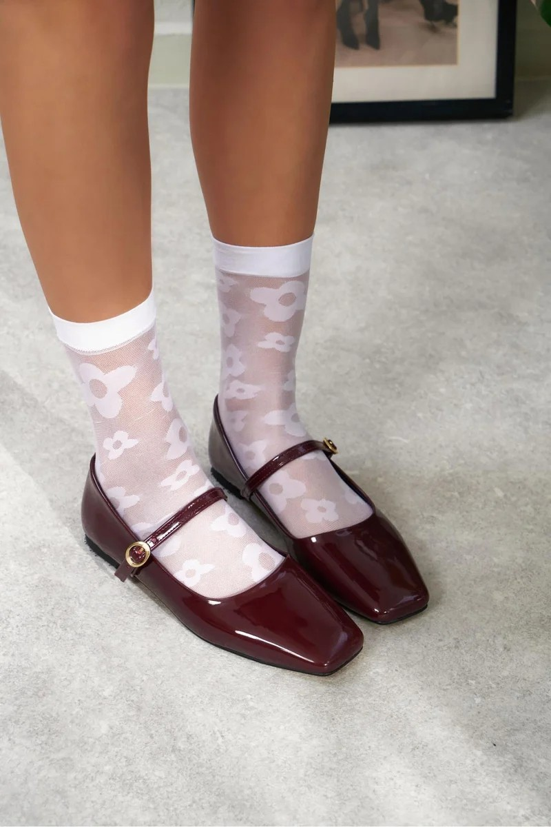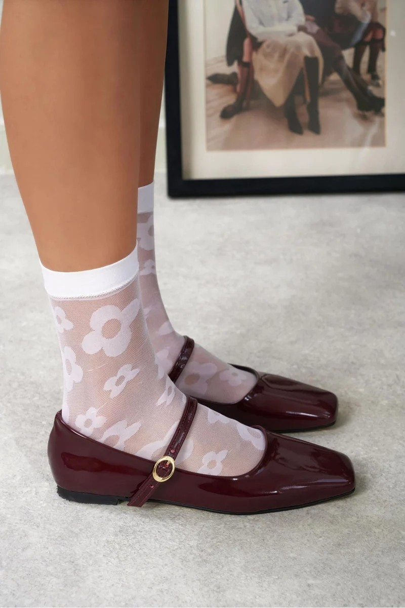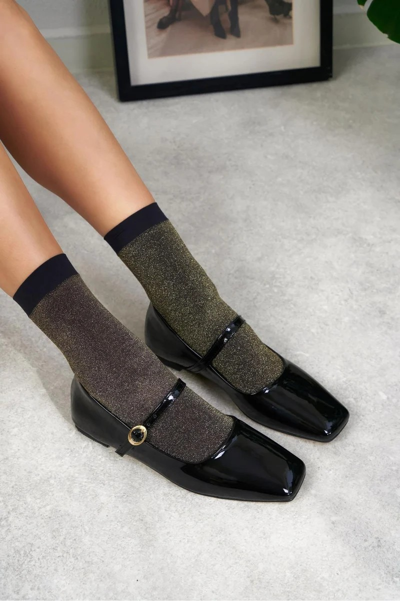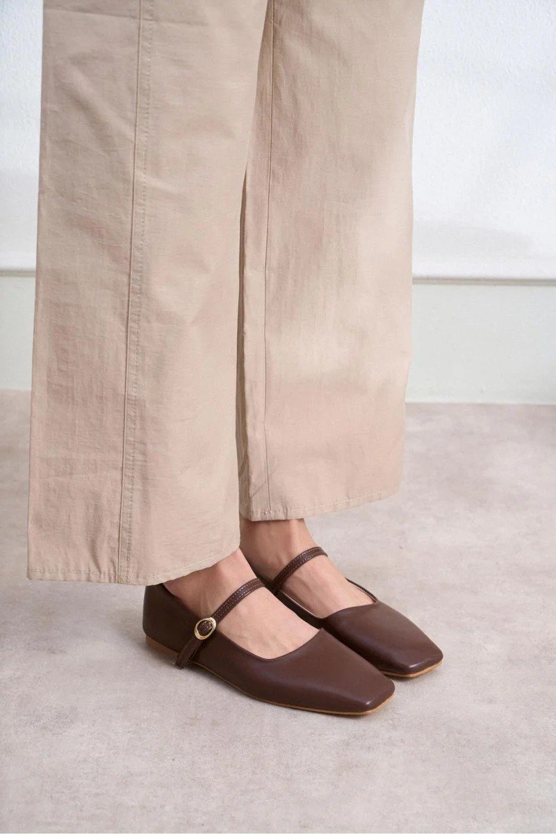 Minimalist ballet flats with a soft matte finish, featuring a single slender strap with a gold buckle and a structured square toe for a modern, refined look.