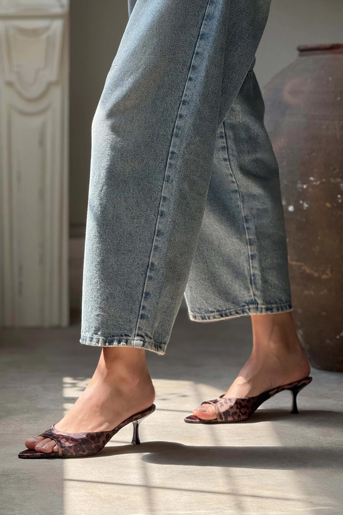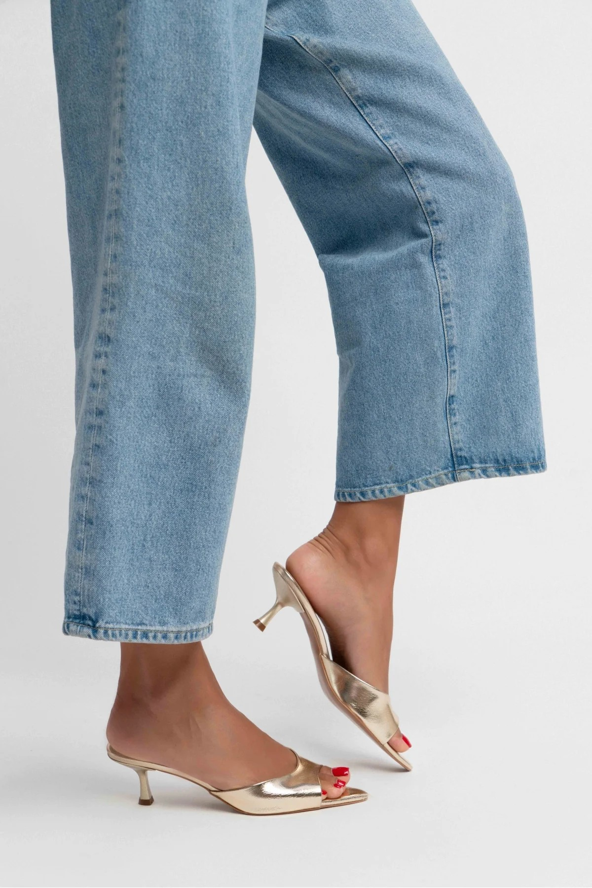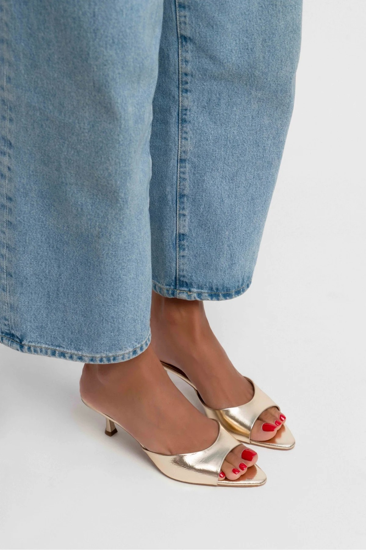 Sleek slip-on mule featuring a minimalist design with an open toe and sculpted kitten heel. Perfect for both casual and dressy occasions