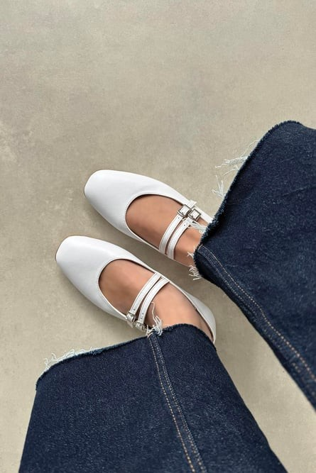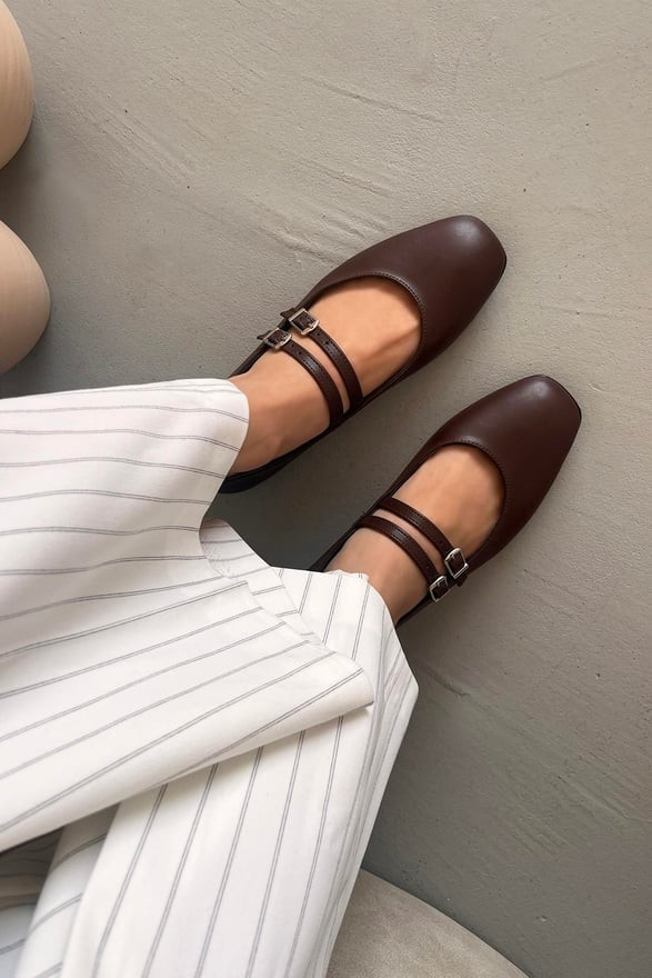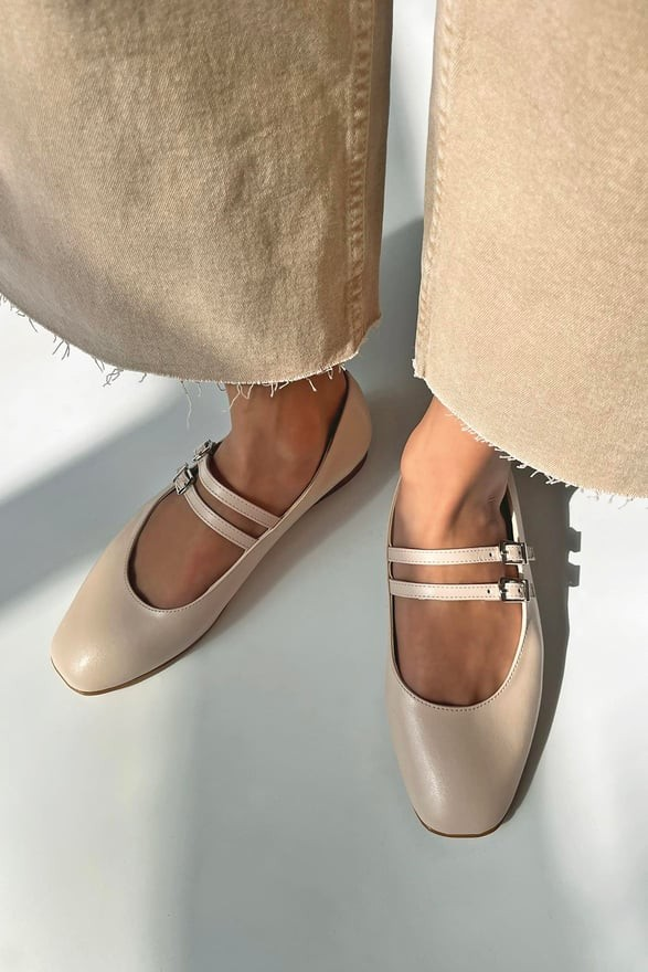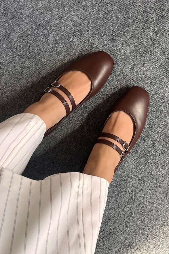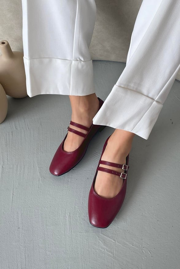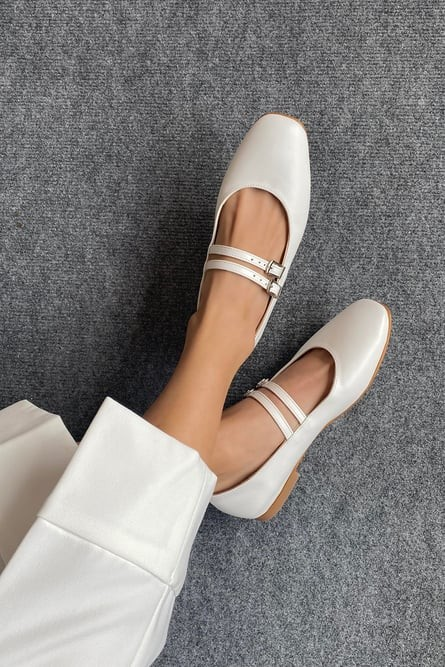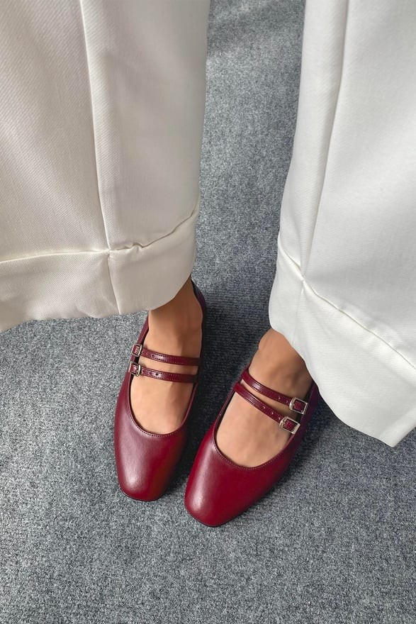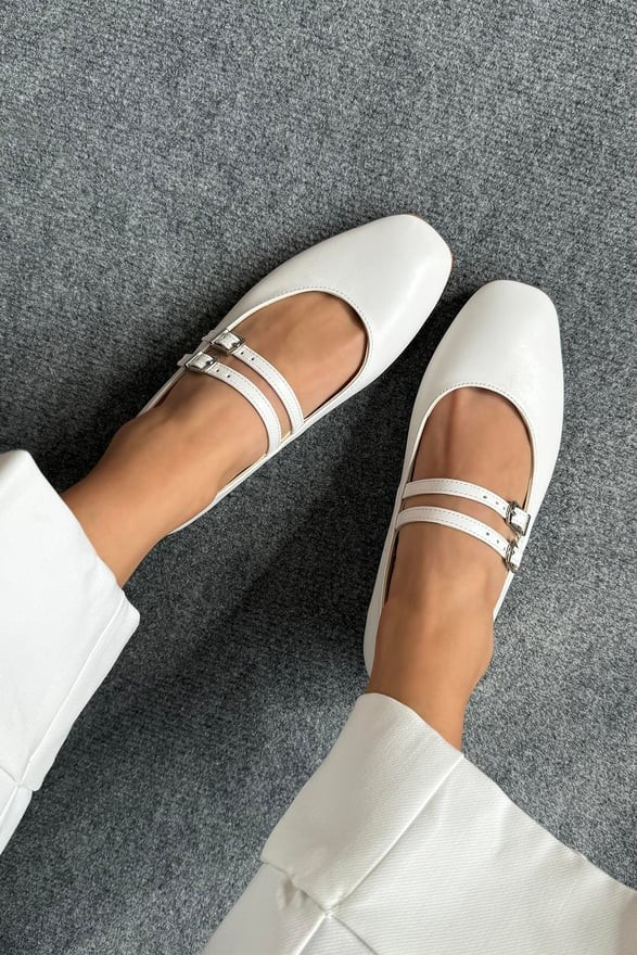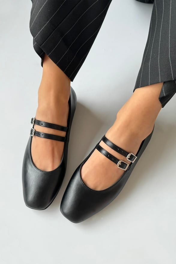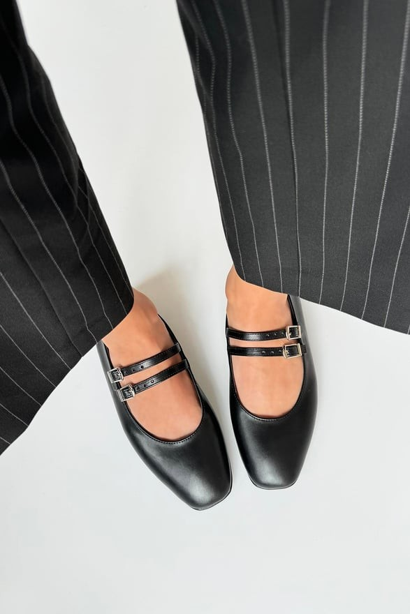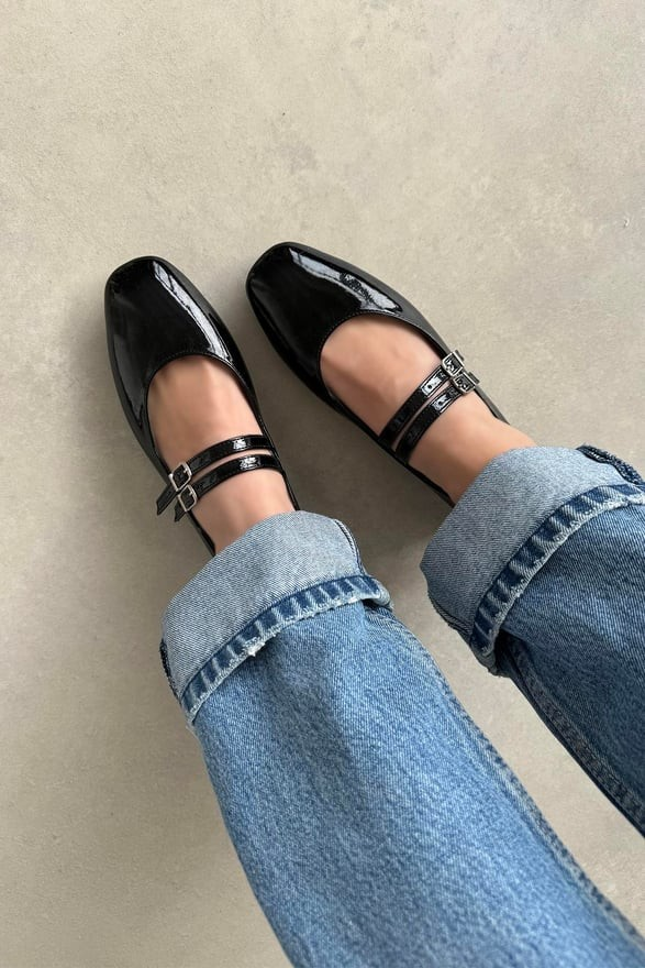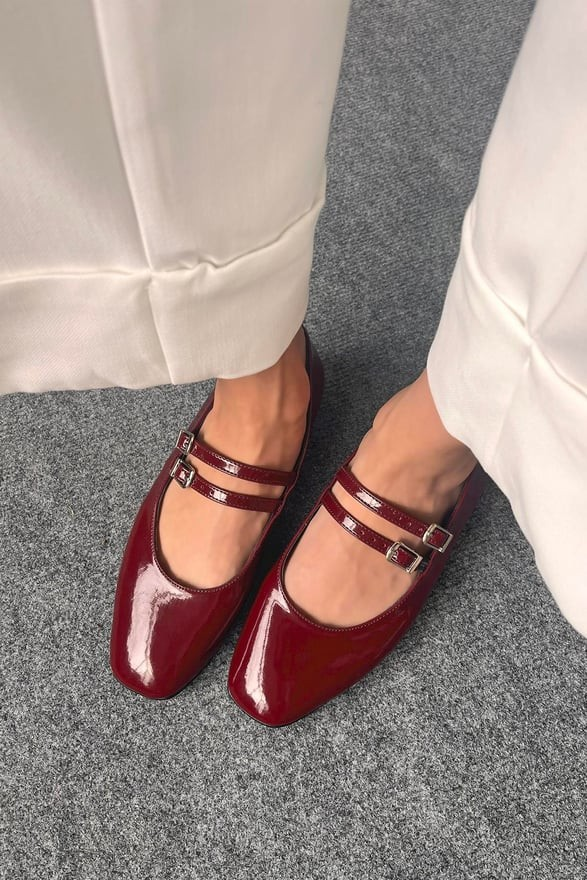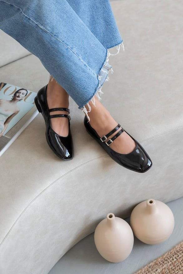 Chic Mary Jane flats with a glossy and matte finish, double buckle straps, and a modern square toe design rerflect for effortless style.