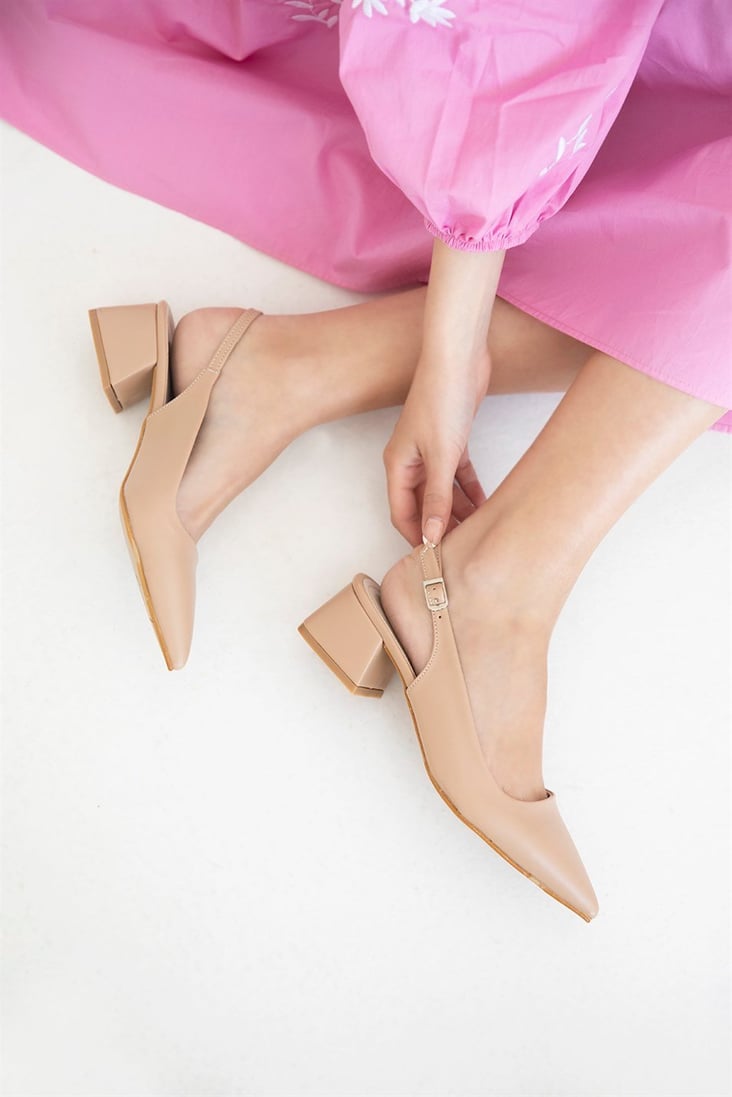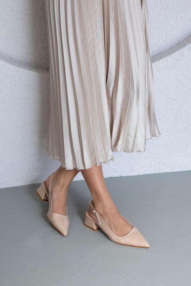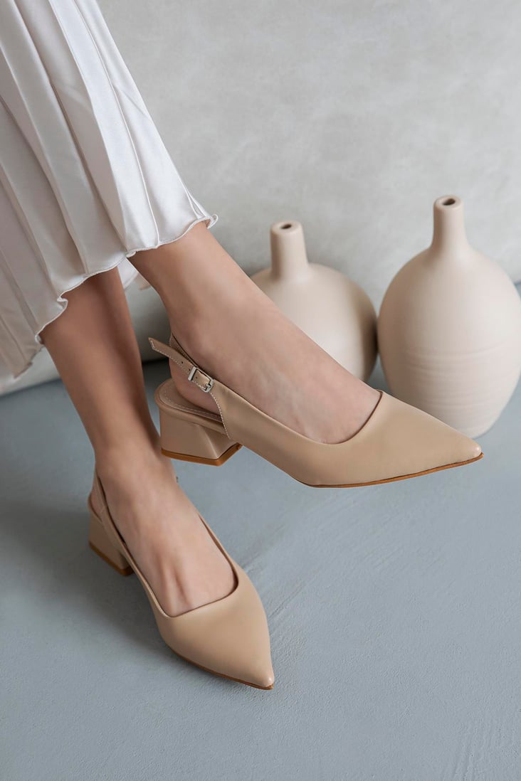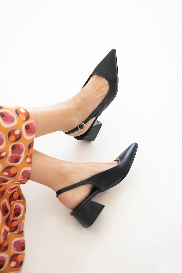 Minimalist slingback heels with a sharp pointed toe and block heel sleek, modern, and effortlessly versatile