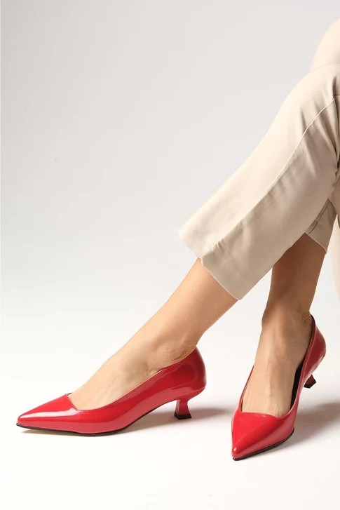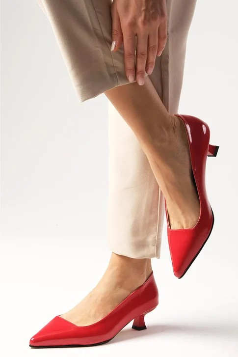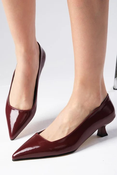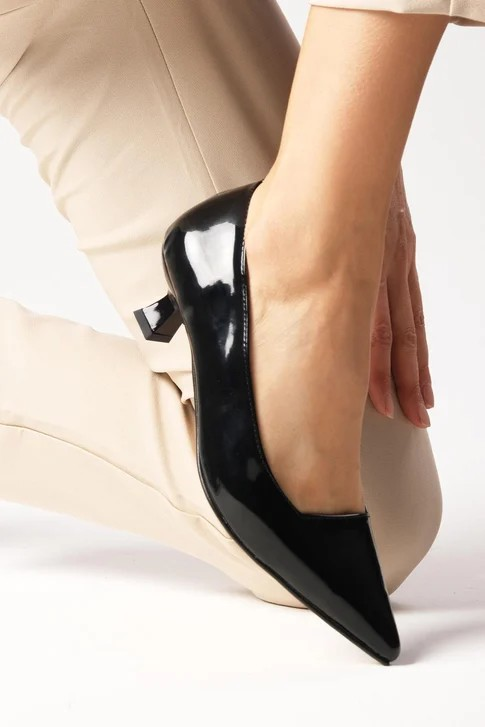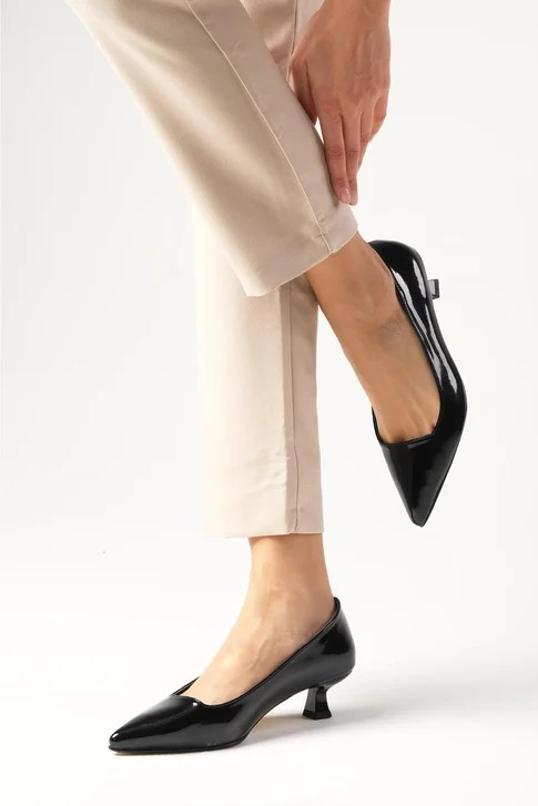 Sleek patent pumps with a sharp pointed toe and a delicate kitten heel designed to bring refined elegance and a touch of glamour to any occasion.