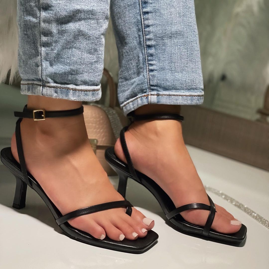 Elegant and minimal strappy heeled sandals with a square toe and ankle strap buckle closure. Perfect for dressing up your everyday denim or complementing a sleek evening outfit.