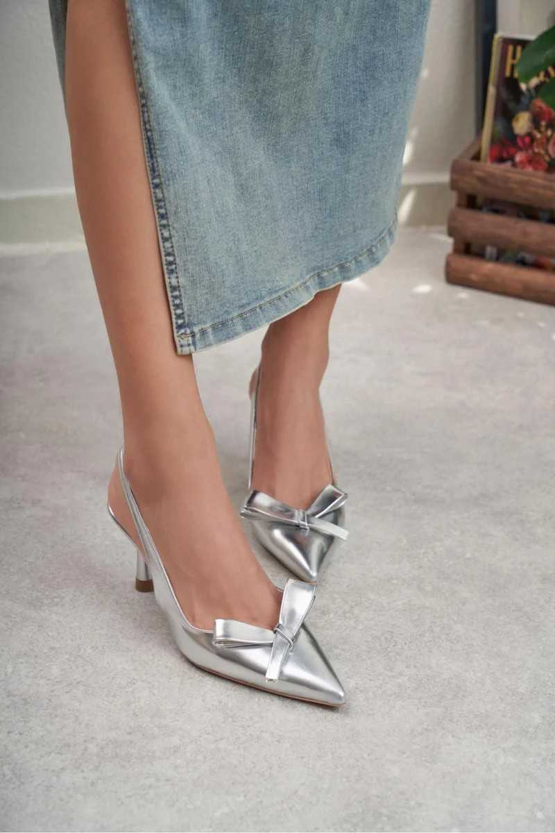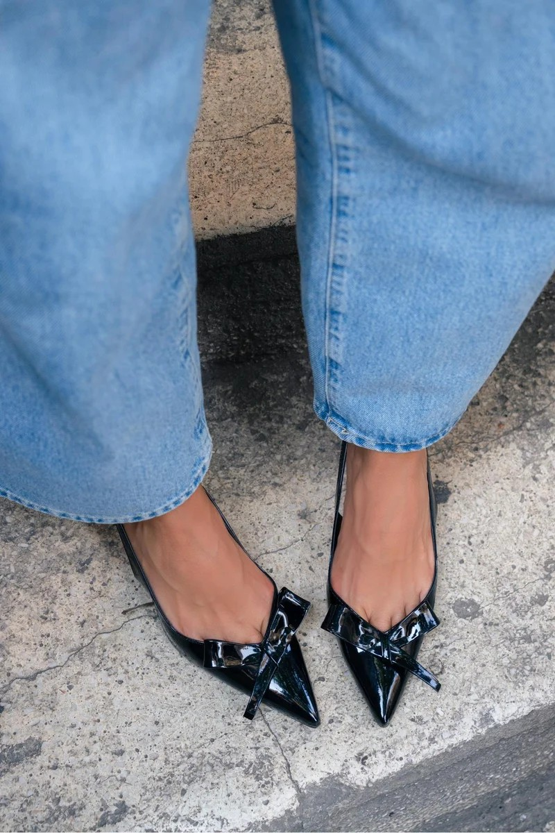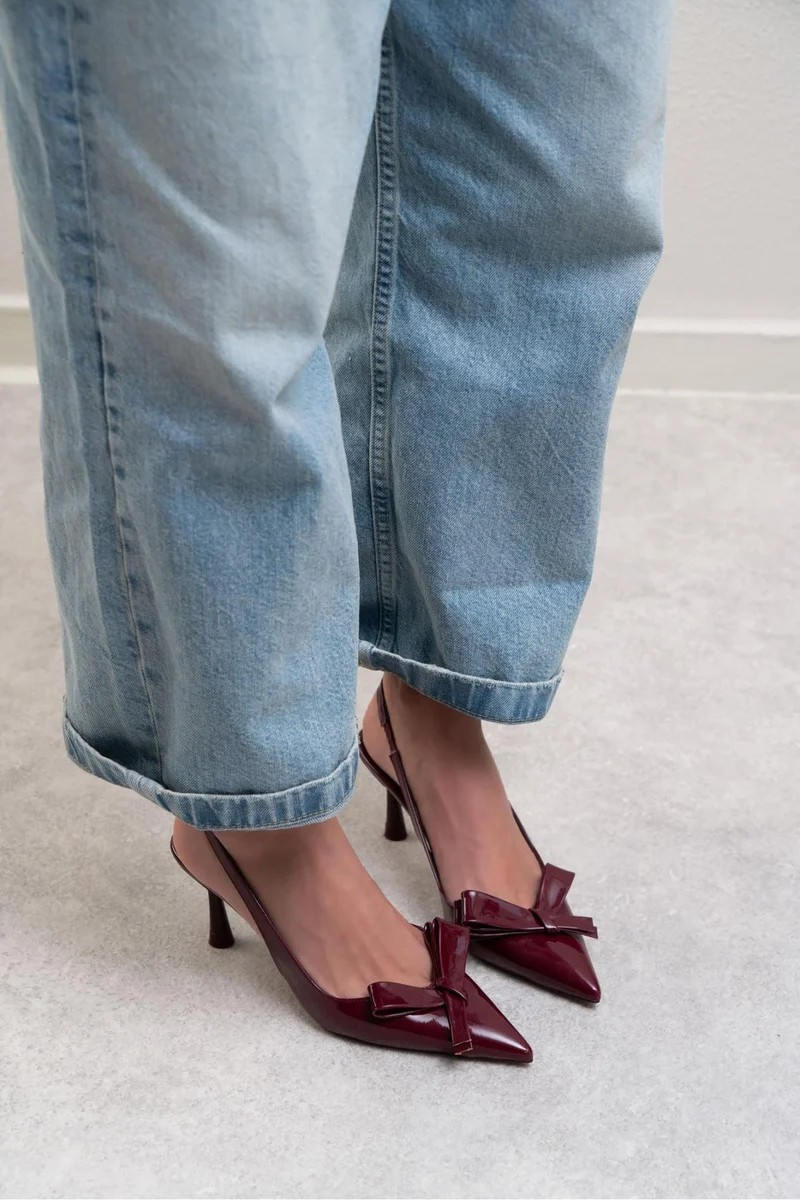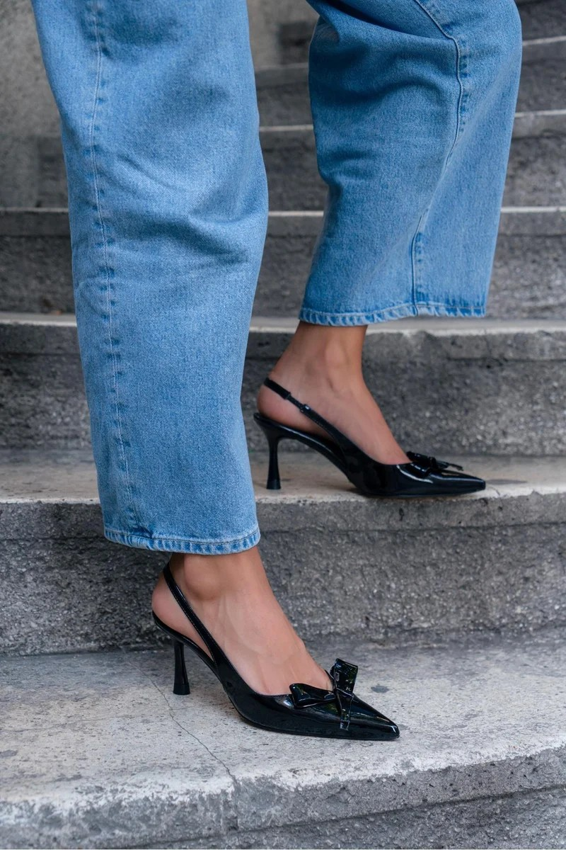 Feminine slingback heels with a pointed toe, glossy finish, and a chic bow detail elegant and playful for day or night.