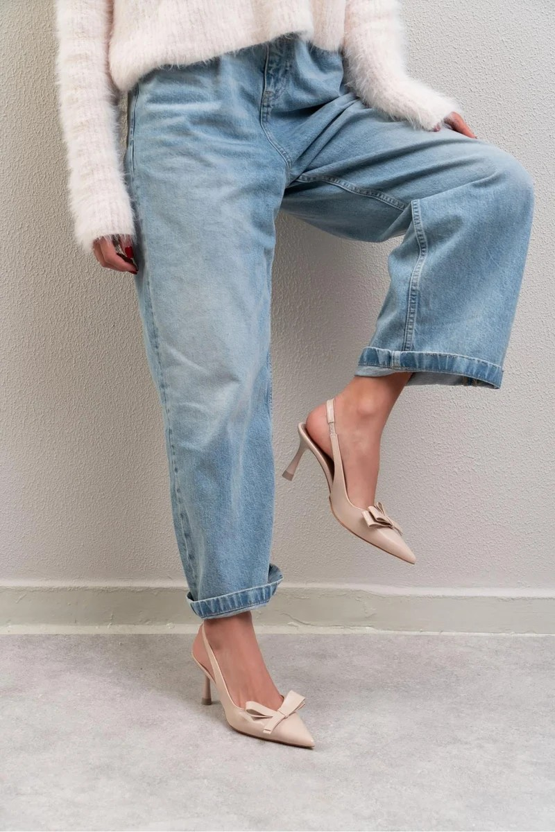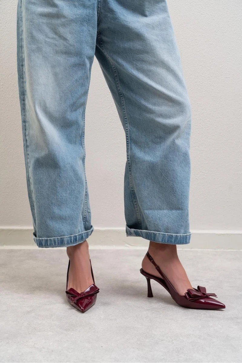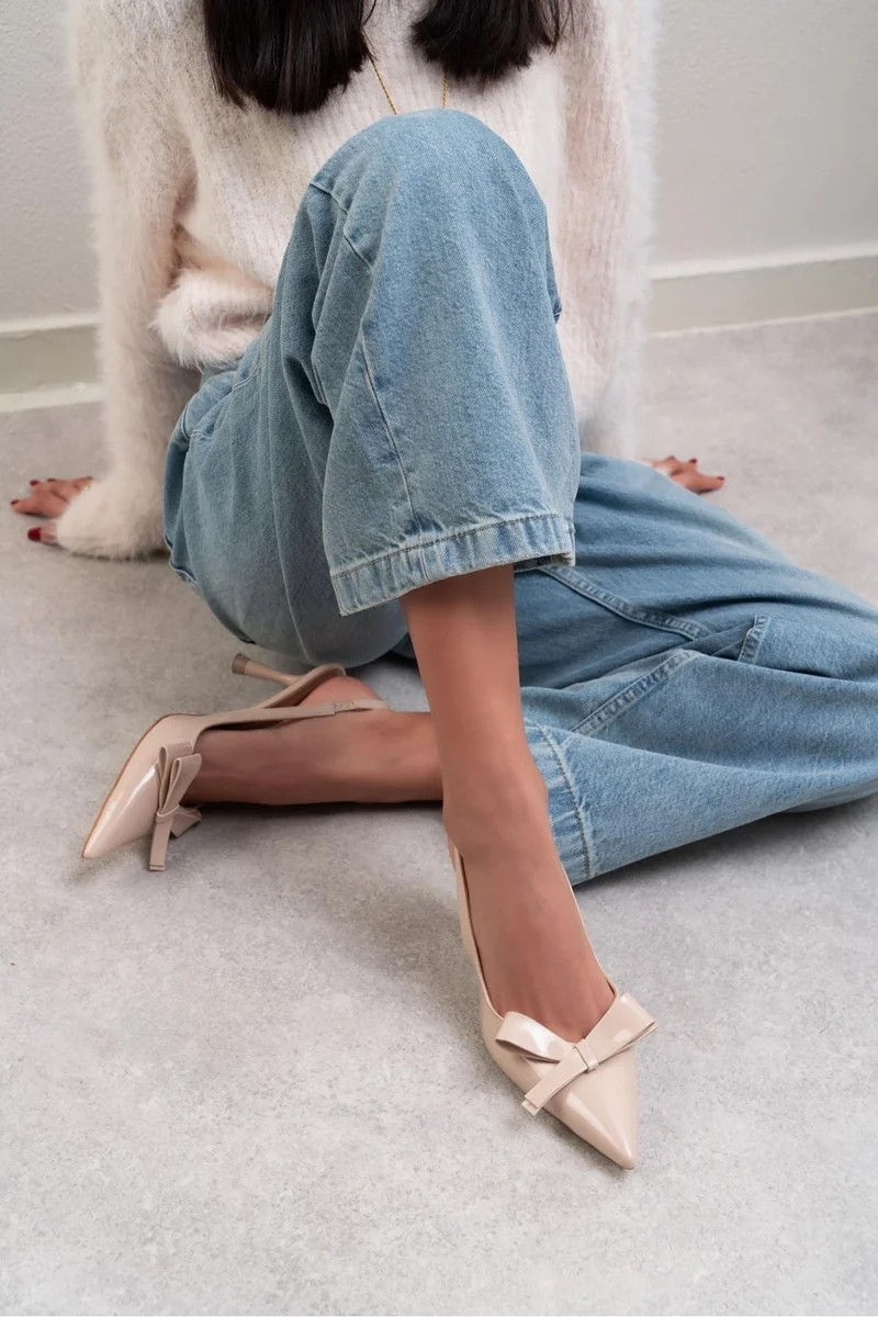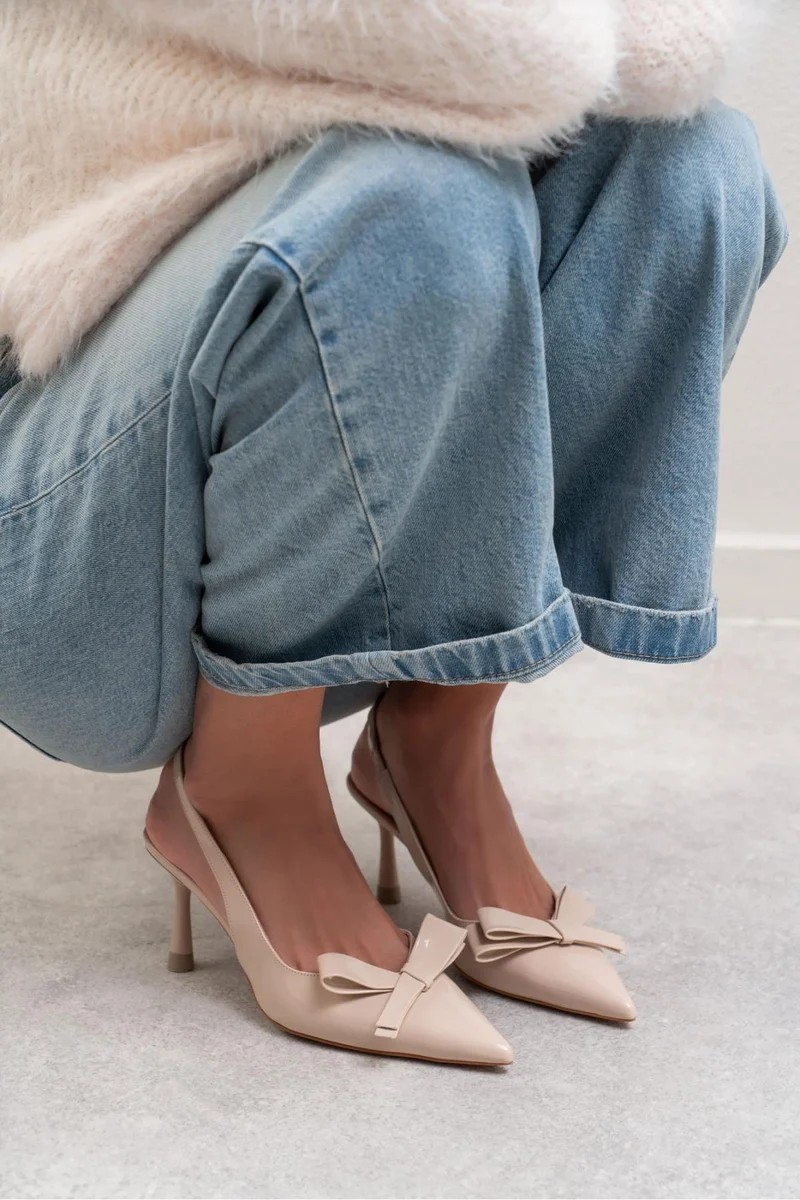 Feminine slingback heels with a pointed toe, glossy finish, and a chic bow detail elegant and playful for day or night.