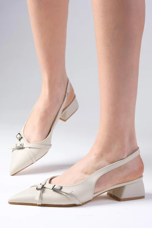 Elegant pointed-toe slingback flats featuring double buckle detailing, a structured vamp, and a low block heel designed for timeless style and everyday comfort.